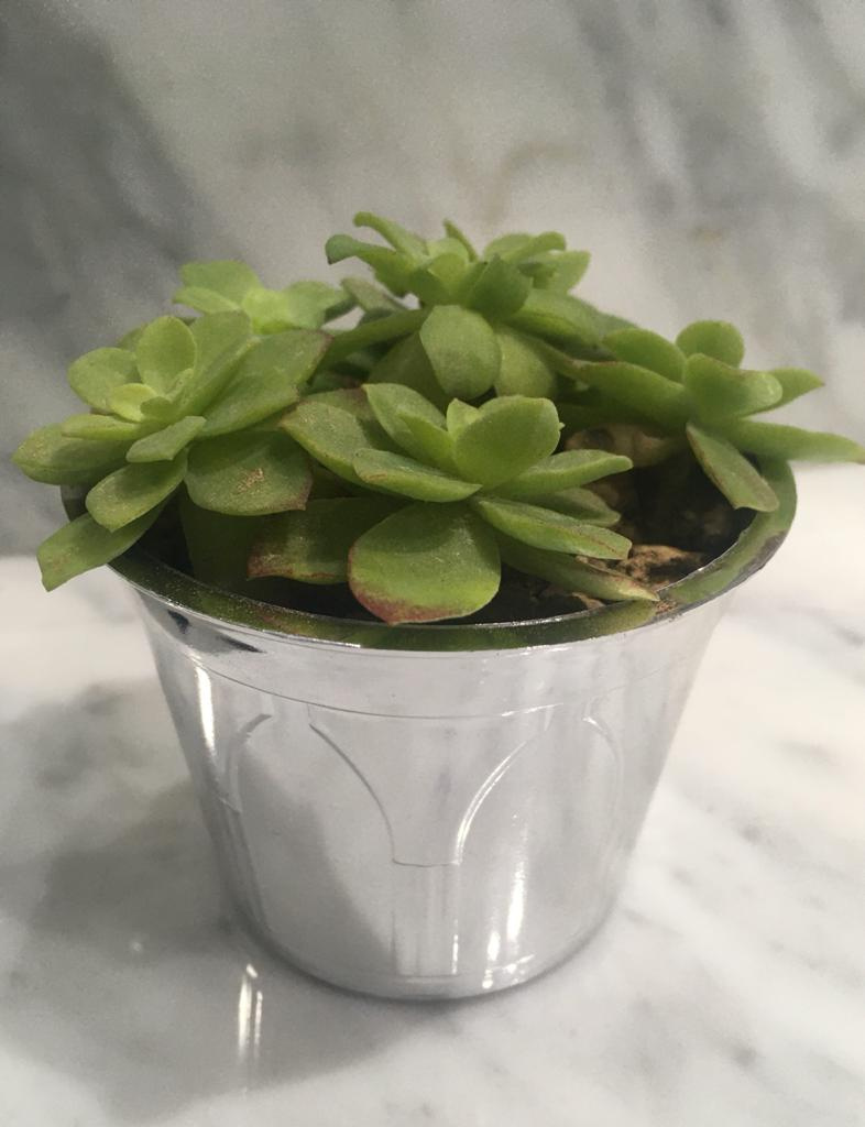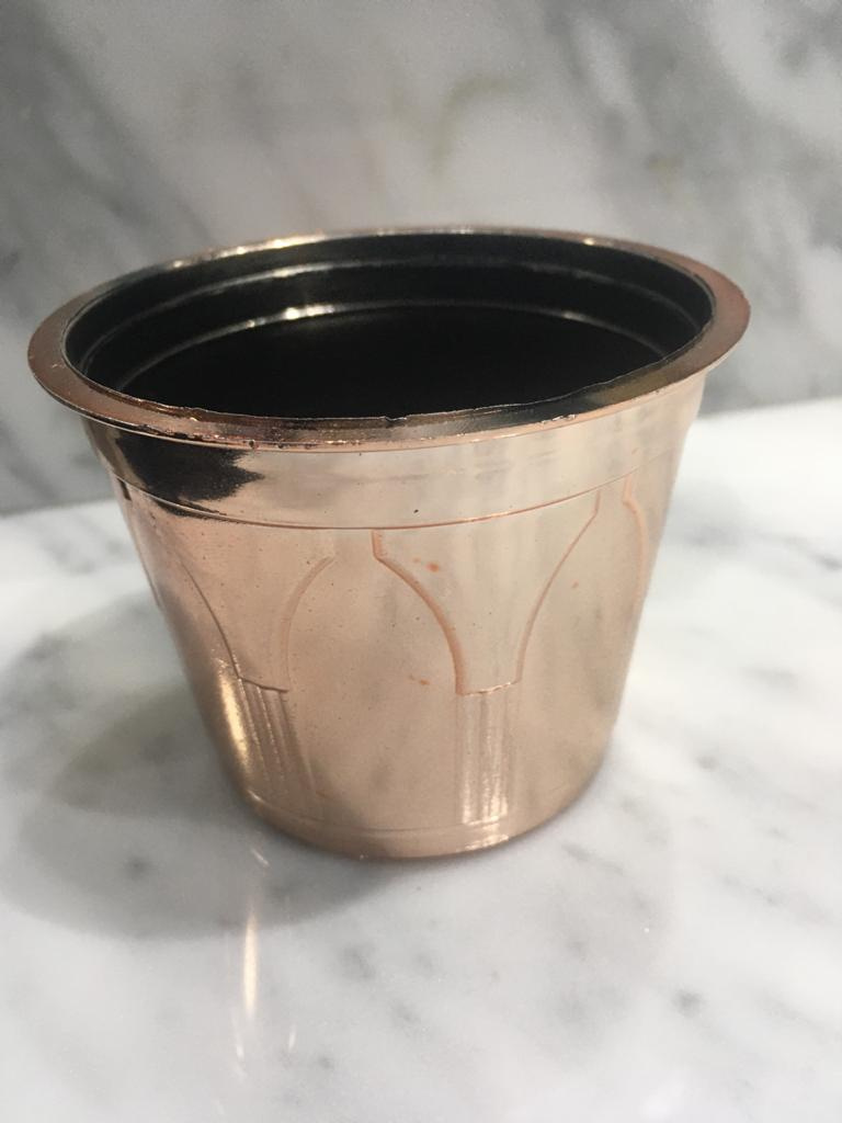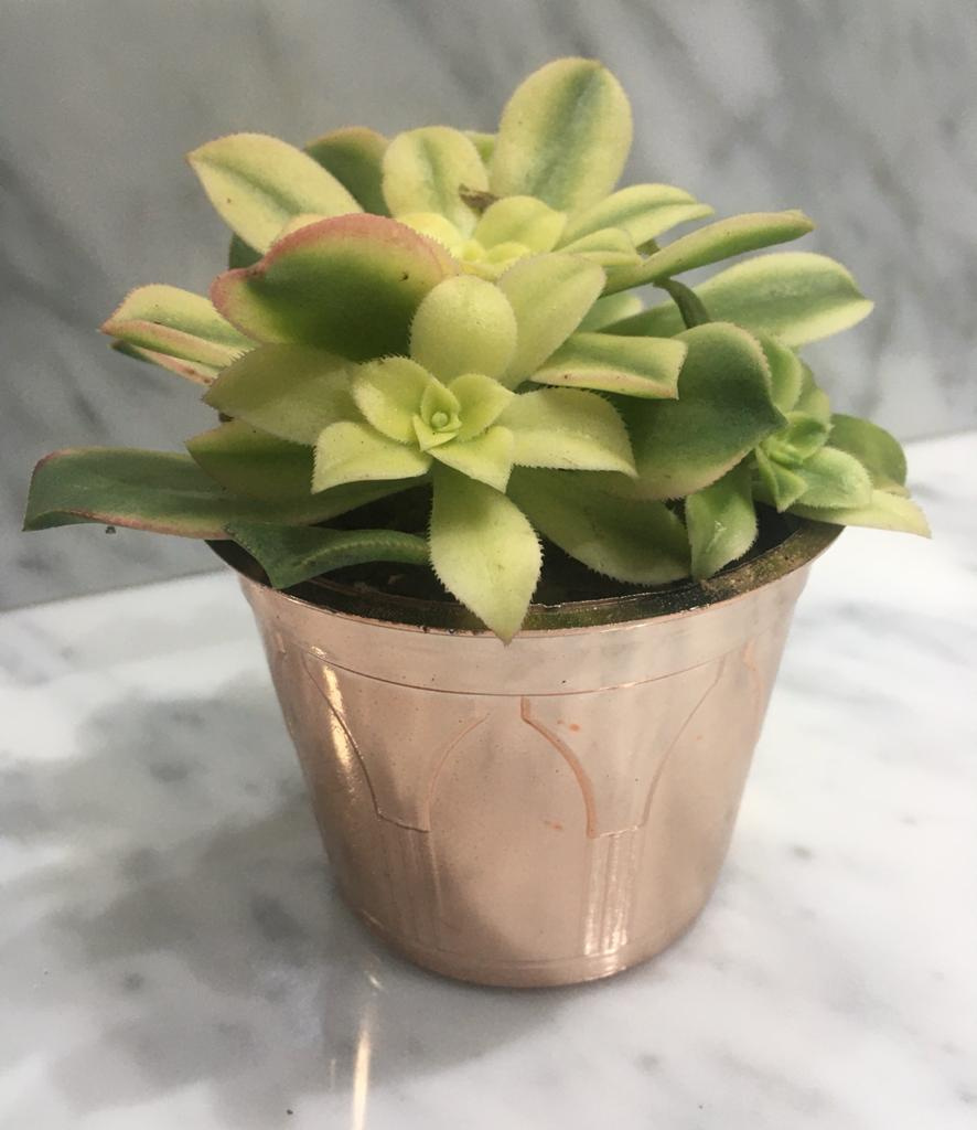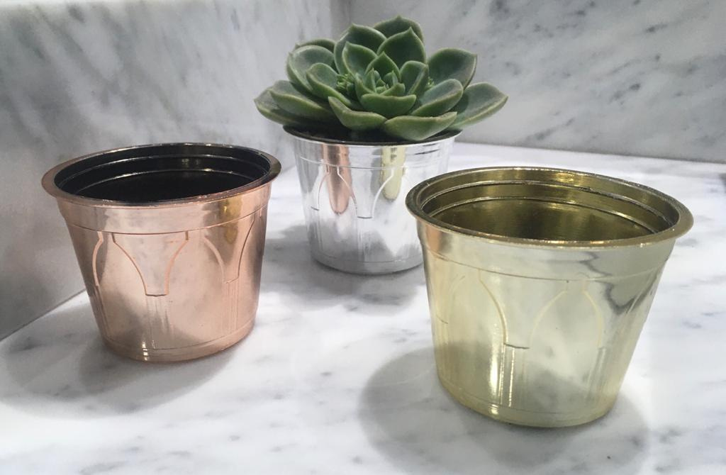 Vaso plástico confeccionado em polipropileno (PP), o que garante resistência e tenacidade, bem como resistência à umidade. Tem diâmetro máximo de 87 mm, diâmetro mínimo de 61 mm e altura de 65 mm, de modo que é perfeito para o plantio de violetas, suculentas e mudas, a exemplo de temperos e especiarias próprias para o cultivo em apartamento e outras áreas confinadas. Esses vasos são pintados em cores metalizadas - ouro, prata e cobre. É um processo de pintura que garante resistência e durabilidade. As cores metalizadas, por outro lado, trazem brilho e requinte às diferentes decorações a que será adicionadas.