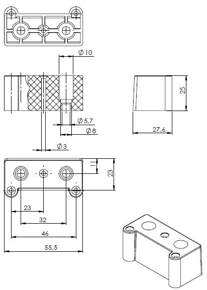 Calço utilizado aplicado a corrediças para manter a distância dos trilhos e para manter peças no movimento correto, como gavetas e outros itens deslizantes.
